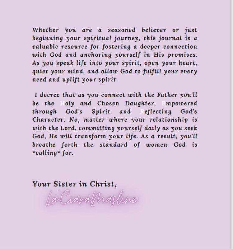 This journal is a sacred tool that empowers women to discover their inner strength, embrace their divine purpose, and walk their faith journey with confidence and joy.T here are 4 journaling segments that allow you to write down gratitude’s of your heart. Each entry provides a sanctuary for women to write down their thoughts, express their emotions, and connect with the divine wisdom that resides within them.